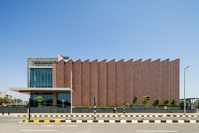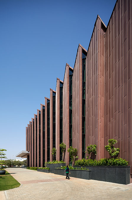 Venkataramanan Associates wählten vorbewittertes Zink für die Außenhülle, weil es die Geometrie des Gebäudes gut zur Geltung bringt. Es ist ein Material, das einerseits im industriellen Sektor häufig für Dächer und Fassaden eingesetzt wird und andererseits durch seine Flexibilität und Verarbeitungsmöglichkeiten auch ungewöhnliche Fassadenformen unterstützt. In Bengaluru setzt VMZINC in PIGMENTO rot sowohl die markanten Lamellen in Szene als auch die anderen Fassadenseiten mit ihren großen opaken Flächen. Eine fassadenübergreifende Stehfalzdeckung mit versetzten Fugen sorgt für Auflockerung und Struktur, ohne dass dafür auf andere Materialien zurückgegriffen werden müsste. Der perforierte Bereich auf der Westseite ist so konzipiert, dass er der Fassade eine weitere Schicht hinzufügt, ohne mit dem Hauptmaterial Zink in Konkurrenz zu treten.