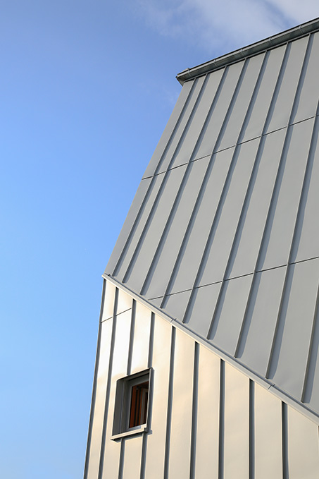 Es gab zwei Hauptgründe, warum die Teams von ASP und Atelier 17c Zink für die Außenhülle wählten. Erstens war das gesamte Projekt auf die Verwendung nachhaltiger Materialien ausgerichtet und Zink erfüllte diesen Anspruch sehr gut: Es hat eine sehr lange Lebensdauer und bleibt über diese Zeit wartungsfrei. So kann es das Gebäude und seine Holzstruktur langfristig vor direkten Witterungseinflüssen schützen. Zudem ist Zink ein natürlicher Werkstoff, der zu 100 Prozent recycelbar ist. Die Wahl fiel aber noch aus einem zweiten Grund auf VMZINC: das hohe Rückstrahlvermögen (Albedo) der sehr hellen Oberfläche AZENGAR. In Grenoble herrschen im Winter weniger kalte Temperaturen als in anderen Teilen Frankreichs. Dafür wird es im Sommer aber deutlich heißer und nachts kühlt es kaum ab. Die sehr helle Oberfläche führt gerade im Sommer dazu, dass ein Teil der eintreffenden Wärme zurückgestrahlt und weniger Wärme in das Innere der Gebäude weitergeleitet wird. So sinkt der Energieaufwand zur Kühlung der Innenräume. Gerade im Sommer trägt Zink dazu bei, dass das Gebäude seine Funktionen im Sinne eines Passivhauses erfüllen kann.