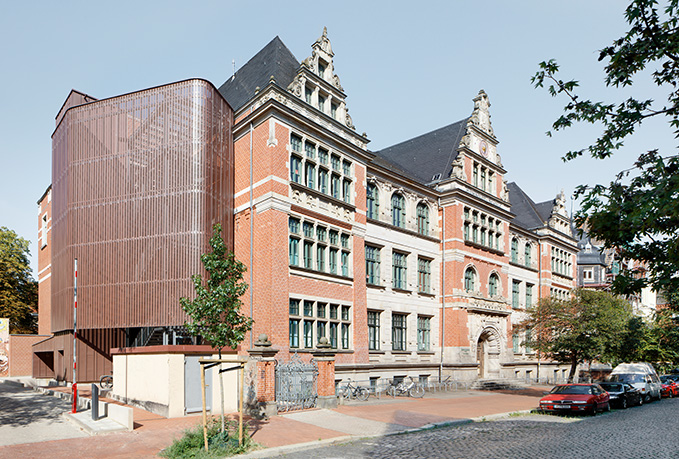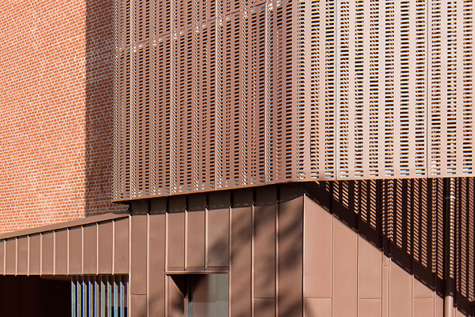 Die Außenhülle, hinter der sich die Erweiterung verbirgt, ist aus perforiertem VMZINC in PIGMENTO rot und damit farblich gut auf das rote Mauerwerk des Schulgebäudes abgestimmt. Dieser Wahl gingen umfangreiche Untersuchungen mit verschiedenen Materialien voraus. Doch nicht nur der rotbraune Farbton überzeugte dRei Architekten Zink einzusetzen. Auch die Materialität von Zink lieferte ein Argument. Die Textur bleibt auf der vorbewitterten Oberfläche weiterhin sichtbar und schafft eine Verbindung zum rauen Klinkermauerwerk. Da der gesamte Ansatz das Historische gekonnt mit dem Modernen verbindet, stimmte auch die Denkmalschutzbehörde dieser Wahl zu.