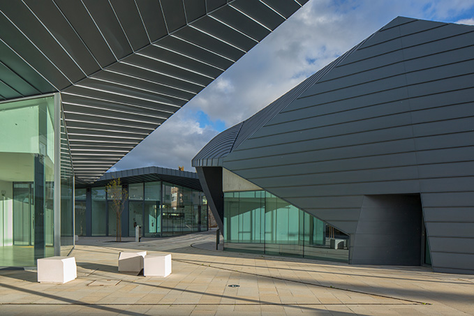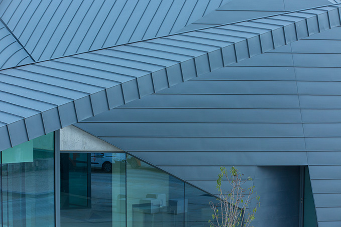 Insgesamt umfasst die mit Zink bekleidete Außenhülle eine Fläche von 1.950 m². Zum Einsatz kam hier durchgehend die VMZINC-Oberfläche PIGMENTO blau. Diese findet sich auch an den großzügigen Dachuntersichten wieder, welche über die verglasten Fensterflächen hinausragen. Verlegt wurde das Zinkblech auf den Dächern, an den Fassaden und an den Untersichten in Stehfalztechnik. Dabei verlaufen die Falze an den Fassaden in horizontaler Richtung. Besonders bei Dunkelheit, wenn das Licht der in den Boden eingelassenen Leuchten von unten an die Wände strahlt, entstehen hier ausgeprägte Licht- und Schattenwürfe.