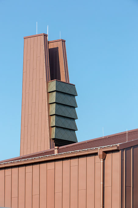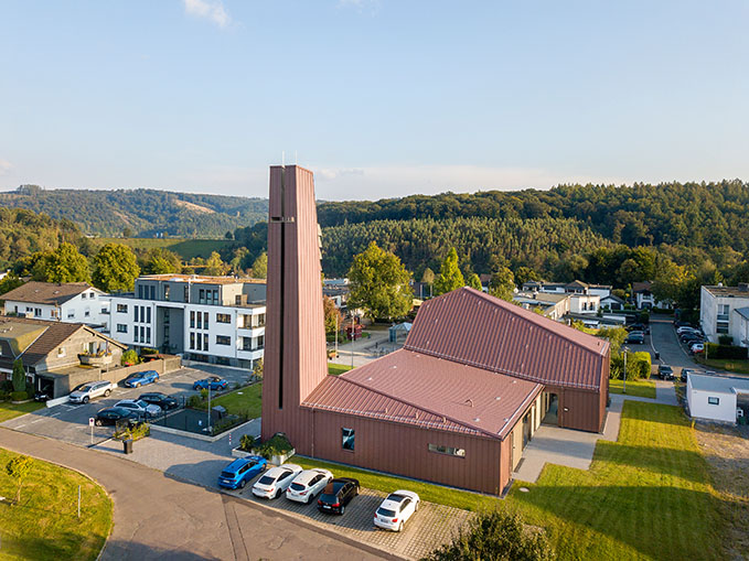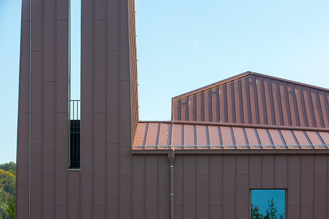 In Anlehnung an die ursprüngliche metallische Eindeckung des Glockenturms wird nun Zink als Material für die Dächer und Fassaden der gesamten Kirche verwendet. Die vorbewitterte, rote PIGMENTO-Oberfläche stellt einen Bezug zu den Ziegelwänden der Vorgängerkirche her. Die weitgehend einheitliche Materialwahl für die Außenhülle unterstreicht die Zusammengehörigkeit des gesamten Gebäudes. Obwohl sich Turm, Kirchenschiff und Gemeinderäume in Form und Höhe unterscheiden, bildet das rote Zink eine übergreifende Klammer. Nur einige wenige Fassadenelemente heben sich durch einen hellen Bronzeton davon ab.